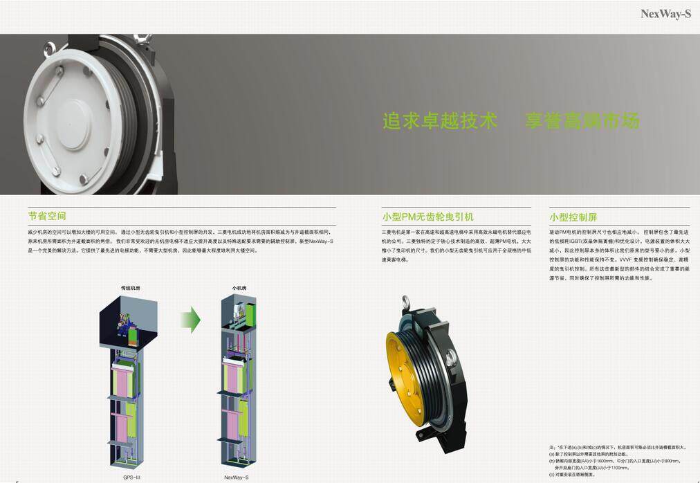 NexWay-S是日本三菱设计的新一代永磁同步无齿轮曳引驱动小机房电梯。由于采用薄型PM曳引机及1∶1的悬吊曳引系统,使其成为真正的小机房(即机房大小等同于井道大小)电梯,并具备了节能、的特性;结合优化的人机界面,给使用者带来更多的方便,是值得信赖的高技术、高稳定的的新一代标准乘客电梯。