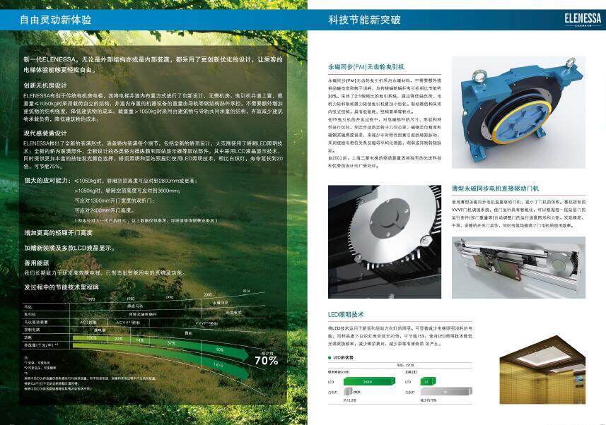 ELENESSA无机房乘客电梯为日本三菱Z新设计开发的全面符合市场需求的无机房电梯产品。ELENESSA的名称是由“ELEVATOR”即“电梯”和“RENAISSANCE”即“创新”这两个词组合而成。因此,ELENESSA这个词有“革新的电梯”意思在里面。ELENESSA 继承了三菱电机的“Quality in Motion” 质量口号。所以说,是建立在“进化的品质”上的产品。ELENESSA无机房电梯具有高度自由化的布置方式和省空间的结构设计,且具有节能性、舒适性和高安全性;拥有完善的救援解决方案,更使ELENESSA无机房电梯享有一般有机房电梯的便捷、可靠。